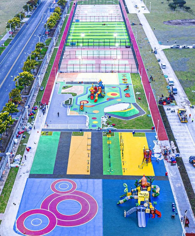 該項(xiàng)目所處位置原為一處待開發(fā)地塊,園區(qū)根據(jù)居民需求規(guī)劃建設(shè)健身跑道、全齡段健身區(qū)、綜合兒童活動(dòng)區(qū)、平地輪滑場(chǎng)、廣場(chǎng)舞片區(qū)和各類球場(chǎng)(其中羽毛球四組、網(wǎng)球場(chǎng)一組,7人制籠式足球場(chǎng)一組、籠式籃球場(chǎng)四組),同步建設(shè)公廁、停車場(chǎng)等配套設(shè)施。