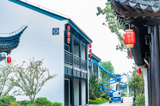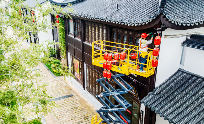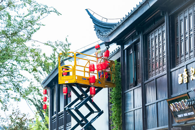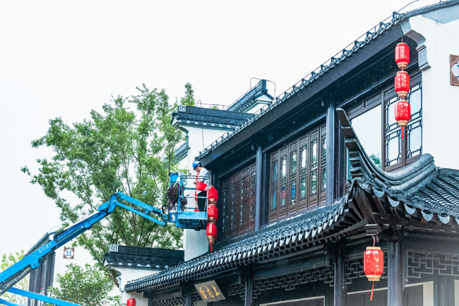 2023年9月25日,蘇宿工業(yè)園區(qū)蘇州街,工人們正在掛燈籠,喜迎中秋、國(guó)慶雙節(jié)到來(lái)。大紅燈籠與白墻青瓦綠樹相映成趣,成為一道靚麗的風(fēng)景線,營(yíng)造了歡樂、喜慶、祥和的節(jié)日氛圍。